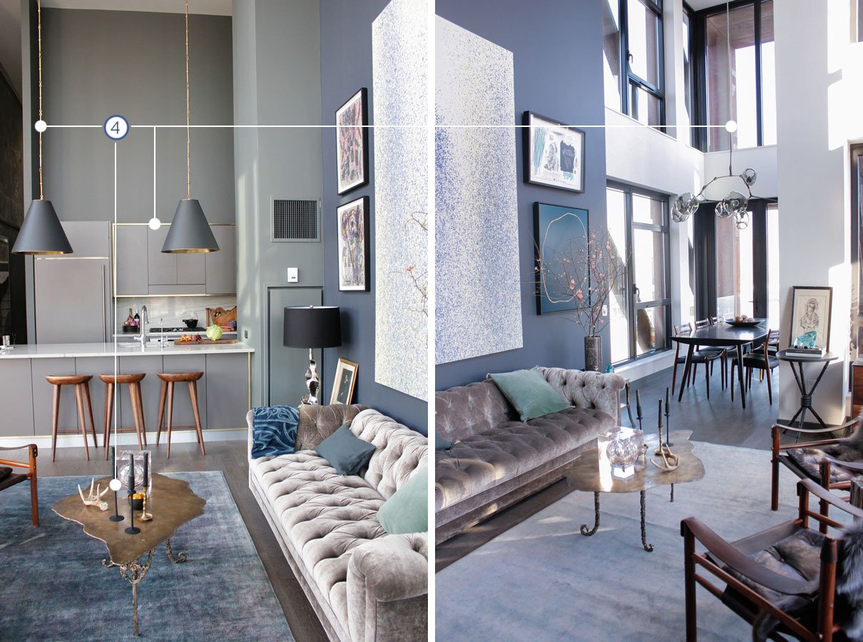 Người thiết kế đã sử dụng chất liệu đồng thau lặp đi lặp lại trong phòng bếp, phòng khách và phòng ăn. Trong phòng bếp, chất liệu đồng thau hiện diện ở các chi tiết trang trí trên cánh tủ và đèn thả trần. Trong phòng khách, nó được sử dụng cho bàn cà phê. Một lần nữa, chất liệu này được lặp lại ở đèn thả trần trong phòng ăn.