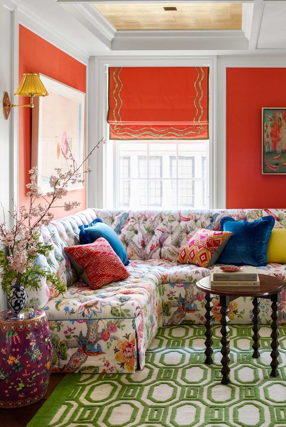 Nghệ thuật treo tường: Những khung tranh sắc màu nổi bật trên nền tường đỏ cam tạo cảm giác vui vẻ, tràn đầy năng lượng cho phòng khách nhỏ. Cách bài trí này giúp đánh lừa thị giác, căn phòng như cao thoáng hơn