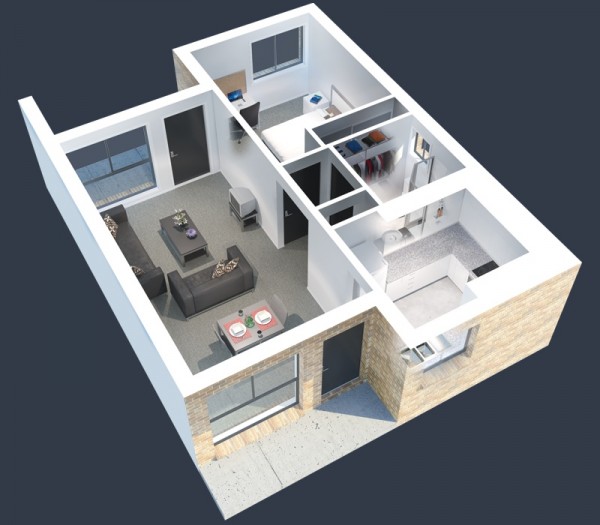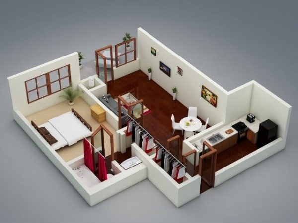 Mẫu thiết kế nội thất căn hộ 1 phòng ngủ với các khu vực chức năng được phân chia riêng biệt và vuông vắn. Ban công, cửa kính lấy sáng cho toàn bộ không gian sinh hoạt.